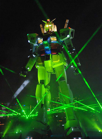 前日(7月10日)の夜にはオープニングセレモニーが開かれ、ライトアップされたガンダム像が目を光らせ、色鮮やかなレーザー光線が飛び交い、華々しいものとなりました